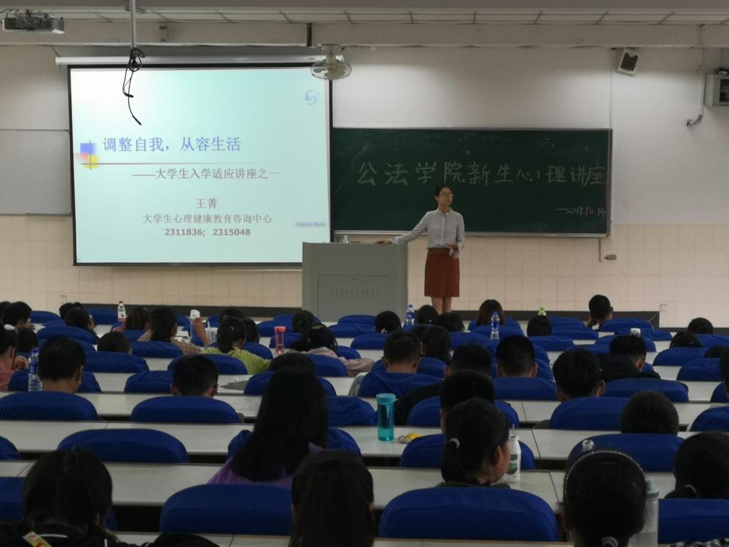 于校秀山校区阶一教102室举办了主题为“调整自我,从容生活”的新生心理讲座。院心理站负责人王菁老师应邀出席并担任主讲人,公法91探花