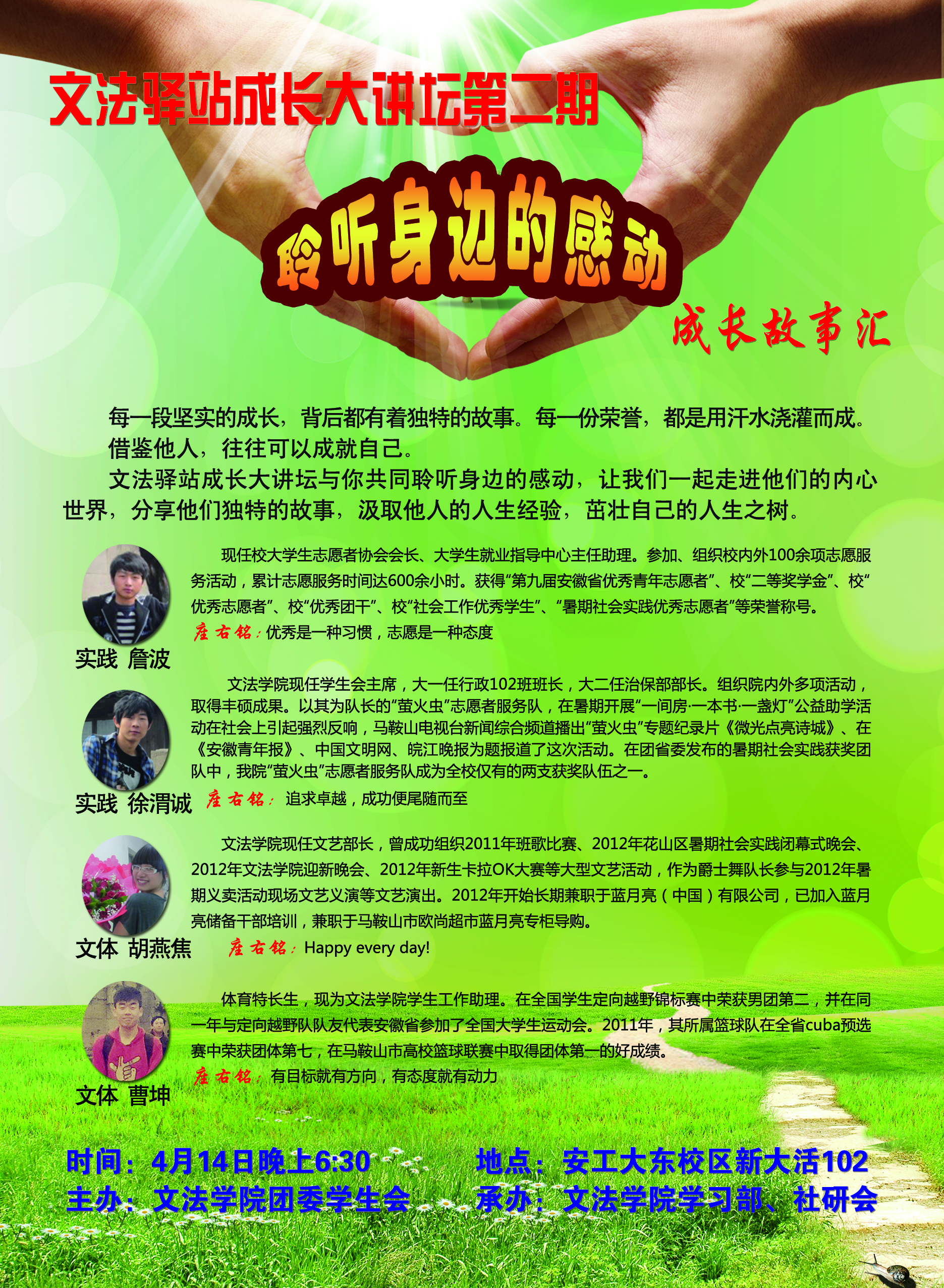 每一段坚实的成长,背后都有独特的故事。每一份荣誉,都是用汗水浇灌而成。借鉴他人,往往可以成就自己。公法91探花 将于4月14日晚6:30在新大学生活动中心102举办公法驿站成长大讲坛第二期——“聆听身边的感动”成长故事汇,届时“第九届安徽省优秀青年志愿者”詹波、现公法91探花 团委学生会主席徐渭诚等将作为我们的嘉宾给我们讲述他们的成长故事。