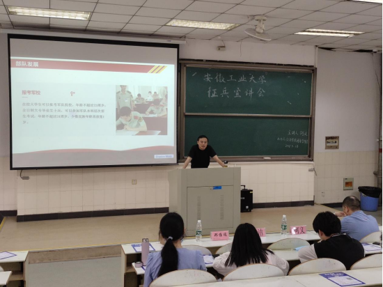 在东区阶教105举行大学生参军入伍宣讲,校保卫处副处长何义老师、征兵办公室主任谢学华老师亲临现场,各年级学生代表参加。