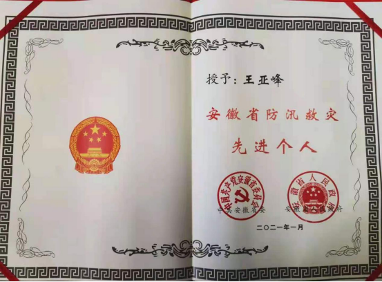 2020年汛期,我省遭遇了历史罕见的洪涝灾害。面来势凶猛的汛情,人们齐心协力共渡难关。在这场防汛救灾斗争中,王亚峰同学作为马鞍山市公安局警令部一级警长积极响应组织号召,投身到抗洪抢险工作之中,努力维护人民群众生命财产安全,此次表彰是对他工作的充分肯定和鼓励。