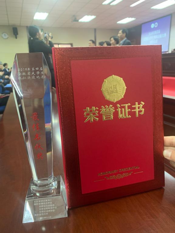 代表队提交的诉讼书状,在二十一支参赛队提交的书状中荣获本次比赛“最佳书状奖”一等奖。在法庭言辞辩论环节,参赛学生吕陈洁获得“优秀辩手”三等奖。