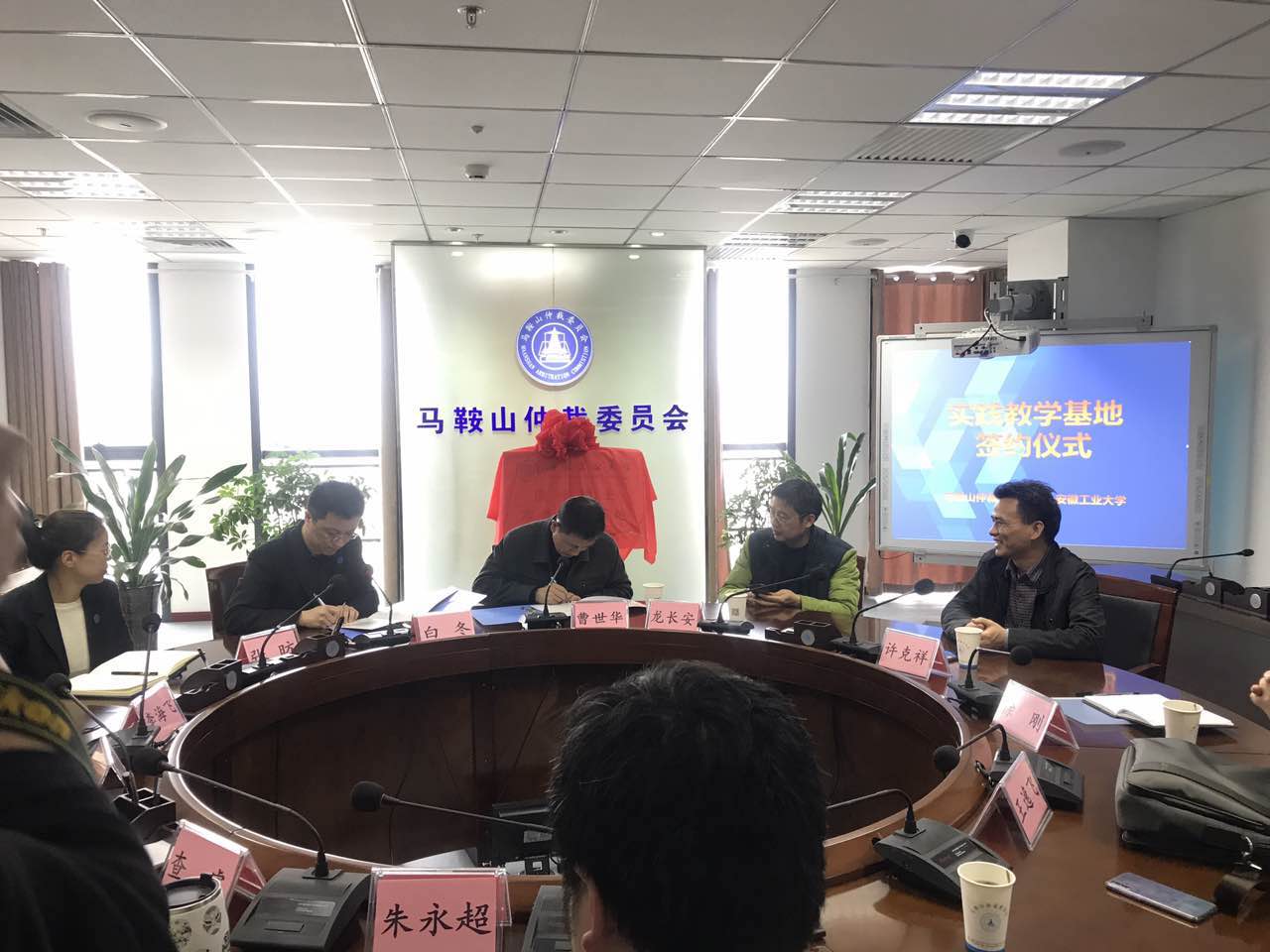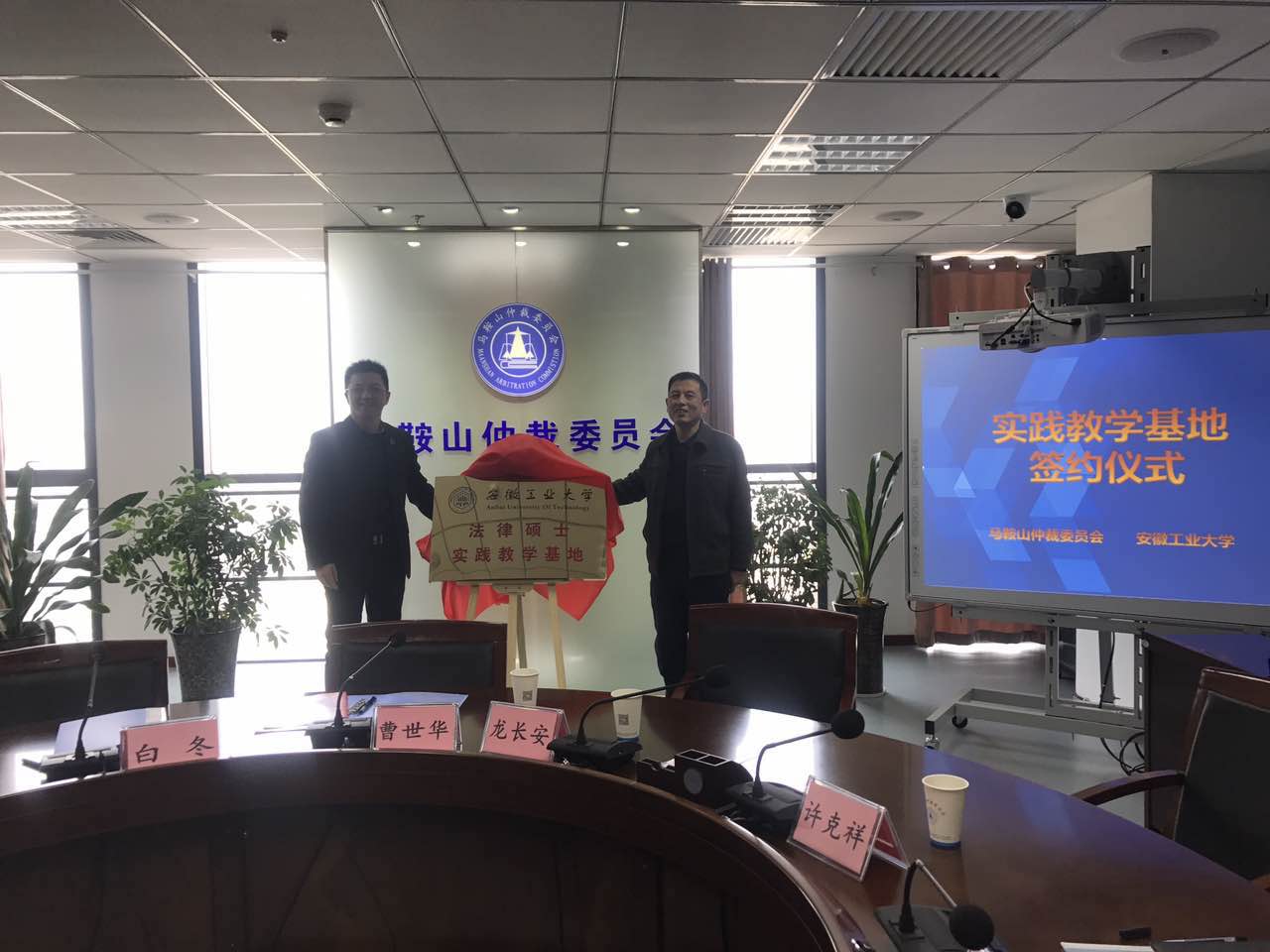 与马鞍山市仲裁委员会在市仲裁委会议中心隆重举行法律硕士实践教学基地签字揭牌仪式。院党委书记曹世华及院领导班子、市仲裁委员会主任白冬及仲裁委各部门负责人出席签字揭牌仪式,法学系负责人及法硕中心组老师参加,仪式由市仲裁委秘书长主持。