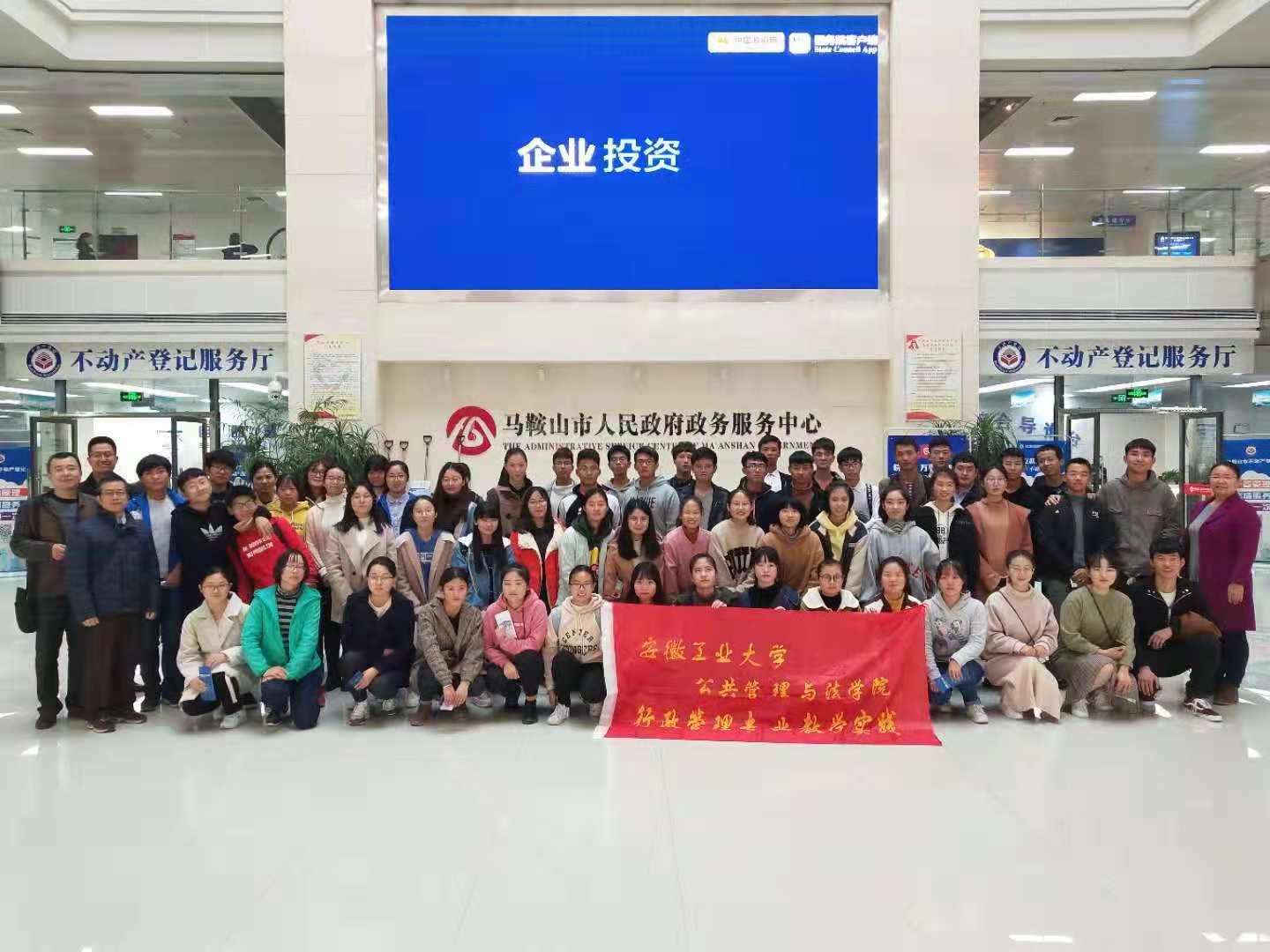 行政管理2018级60余名同学在徐济益、董少林、吴丽丽、吴鹏老师带领下参观了坐落于印山路的马鞍山市政务服务中心。