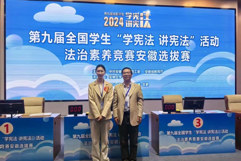 团委承办,所选拔的选手在参加此次安徽省比赛中斩获多项荣誉,法学系主任徐刚指导的法221班吴黛欣同学、法232班刘晴晴同学分获安徽省法治素养竞赛大学组二等奖和三等奖,法222班杨超然同学获安徽省演讲竞赛大学组三等奖,法224班苏宁同学获演讲竞赛大学组优秀奖。